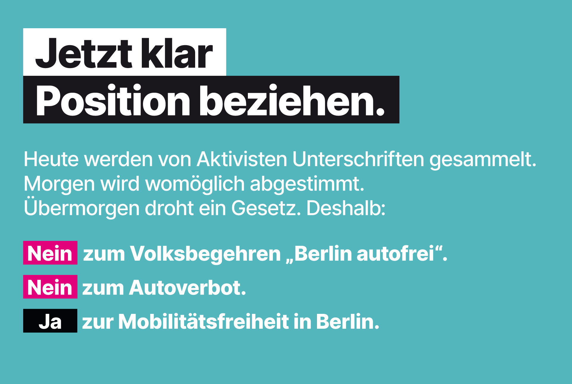 In Berlin läuft ein Volksbegehren. Gut organisierte Aktivisten sammeln Unterschriften gegen das Auto, auch mit Geldern aus dem Ausland. Die Ziele der Autohasser werden von vielen Linken und Grünen unterstützt. Kommen genug Unterschriften zusammen, folgt ein Volksentscheid. Bei Erfolg droht ein Gesetz, das Millionen Berliner direkt trifft.